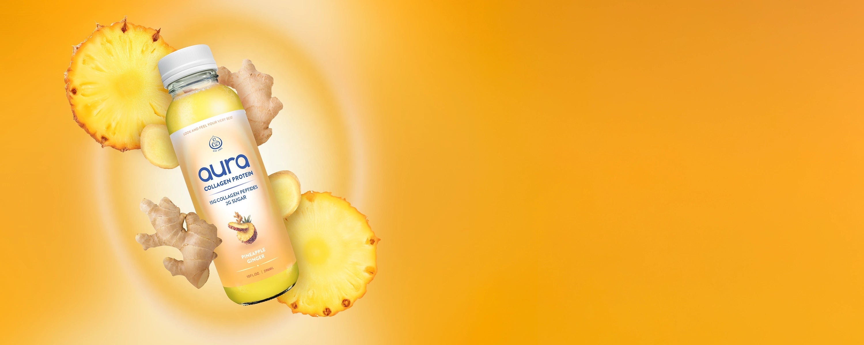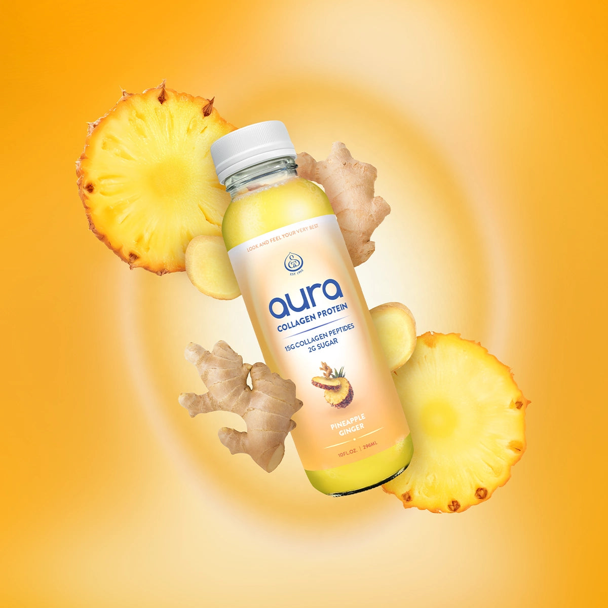 The sweet tang of pineapple offers a refreshing burst, while the warm spice of ginger brings balance and depth. Together, they create a bold, vibrant flavor that awakens your senses. With a delicious, non-chalky finish, every bottle delivers 15g of clean, satisfying protein that’s made from real ingredients. AURA’s one-of-a-kind blend supports stronger joints, glowing skin, and real results. It’s a grab-and-go upgrade to old school powdered protein drinks.