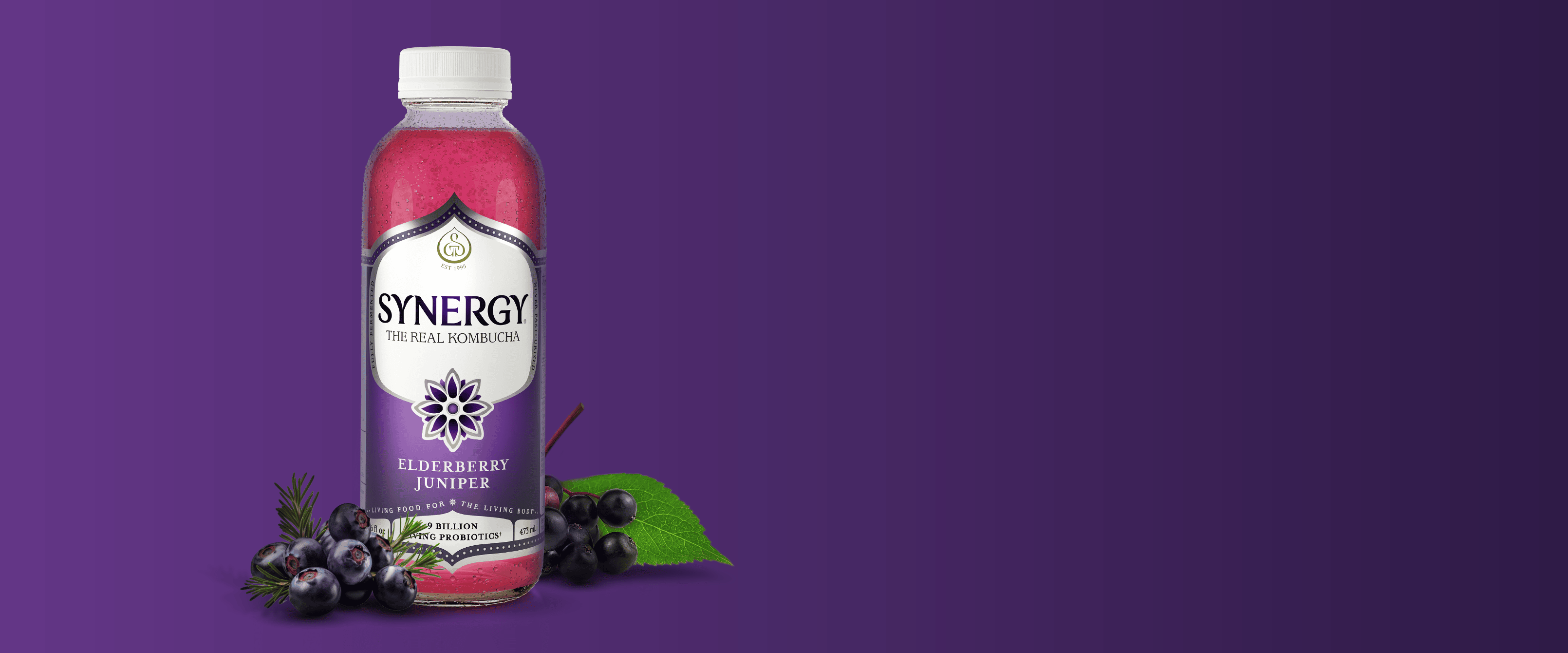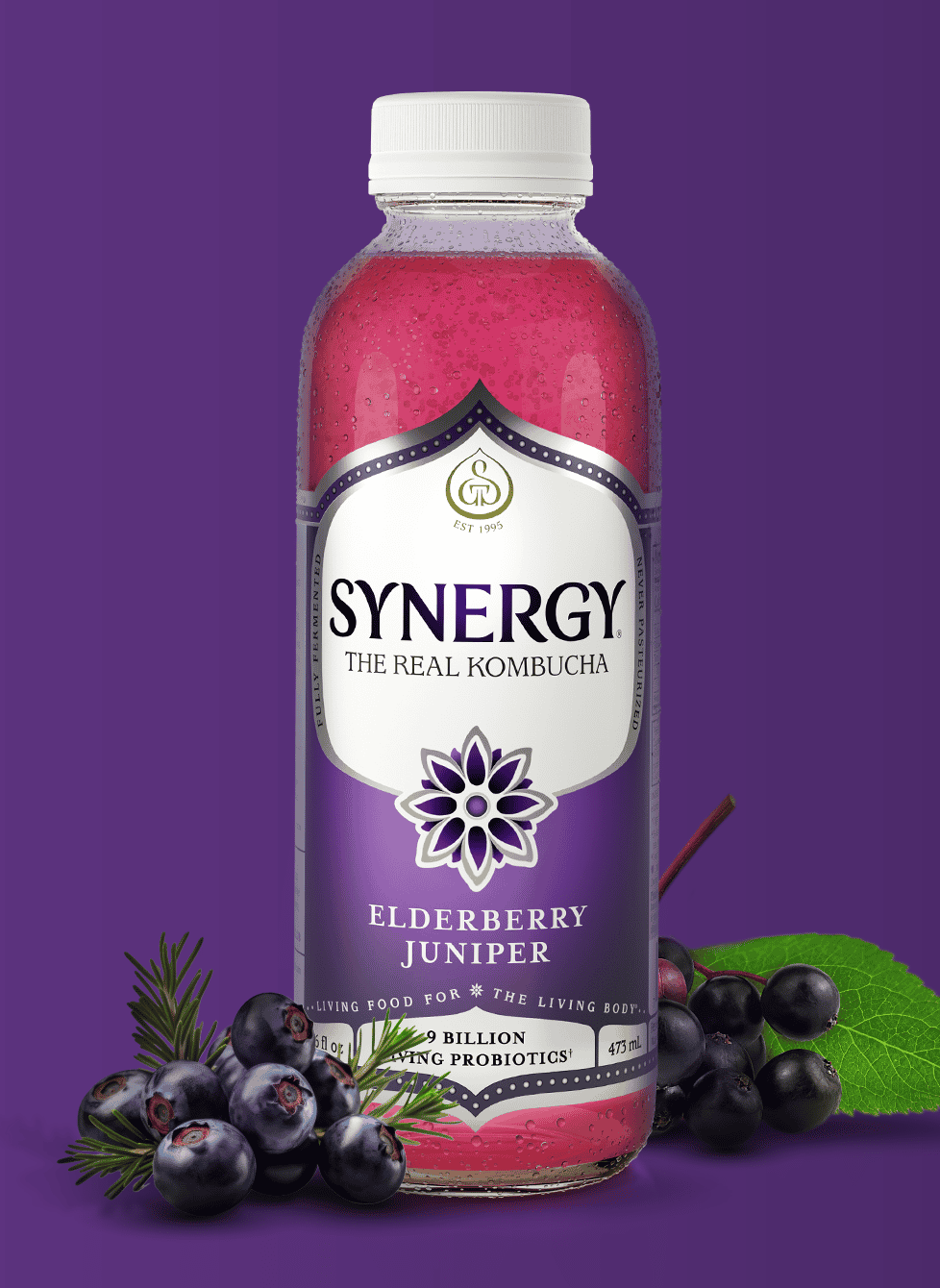 SYNERGY Elderberry Juniper offers two ways to better immunity with a potent dose of antioxidants and vitamin C. The two healing hero ingredients, elderberry and juniper berry, combine for a lightly sweet, tart, fruity, and earthy raw kombucha.